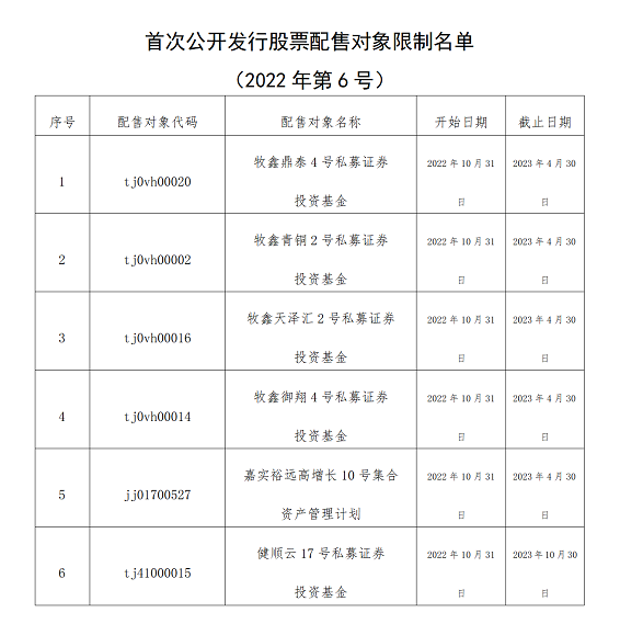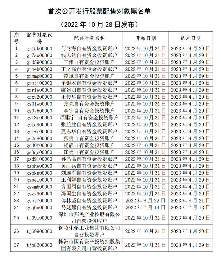 本報(bào)訊 10月28日,中證協(xié)發(fā)布《首次公開(kāi)發(fā)行股票配售對(duì)象限制名單公告(2022年第6號(hào))》和《首次公開(kāi)發(fā)行股票配售對(duì)象黑名單公告(2022年第8號(hào))》。