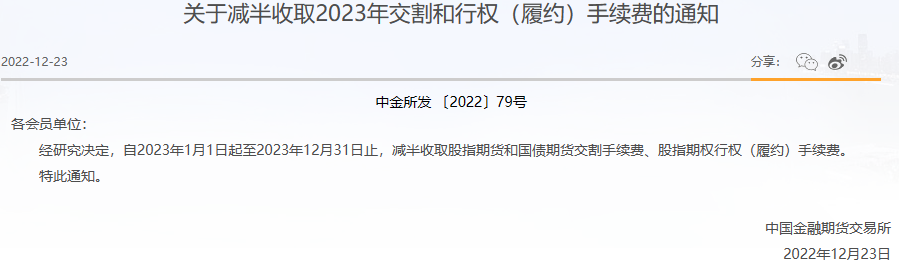 自2023年1月1日起至2023年12月31日止,減半收取股指期貨和國債期貨交割手續(xù)費、股指期權行權(履約)手續(xù)費。