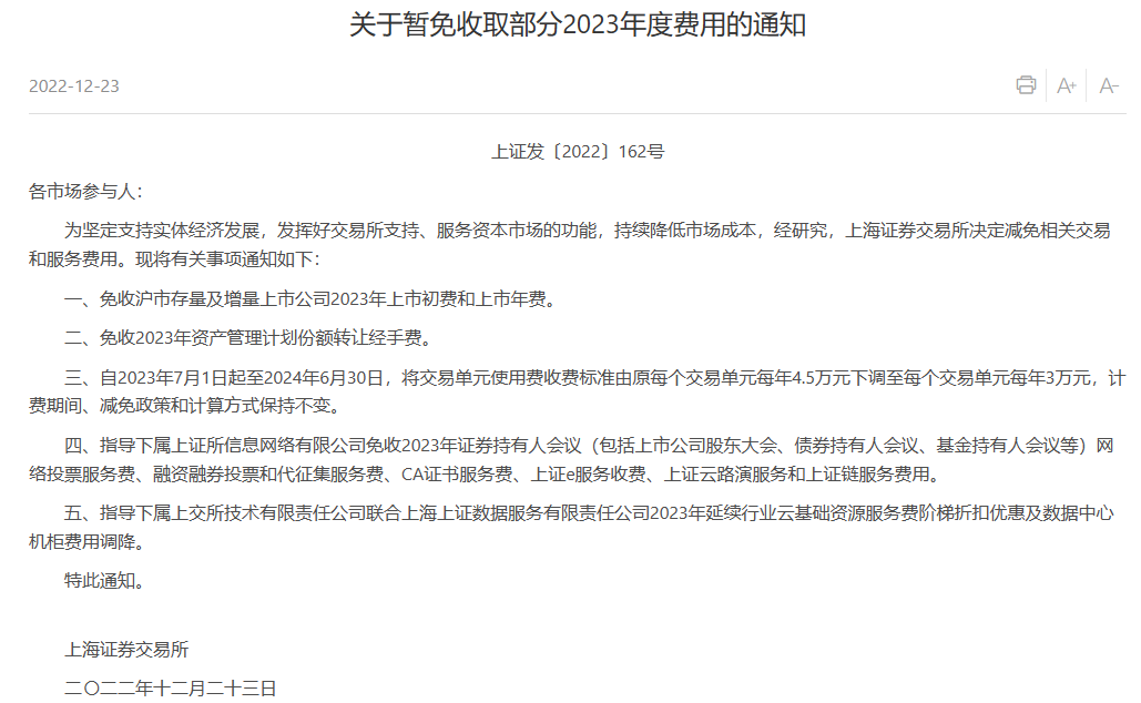 12月23日,滬深交易所分別發(fā)布減免2023年度相關費用的通知,決定免收2023年上市公司上市初費和上市年費。