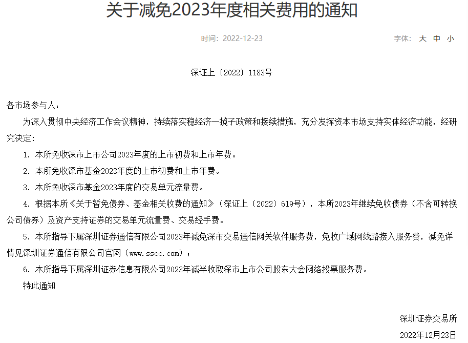 1.免收深市上市公司2023年度的上市初費和上市年費。