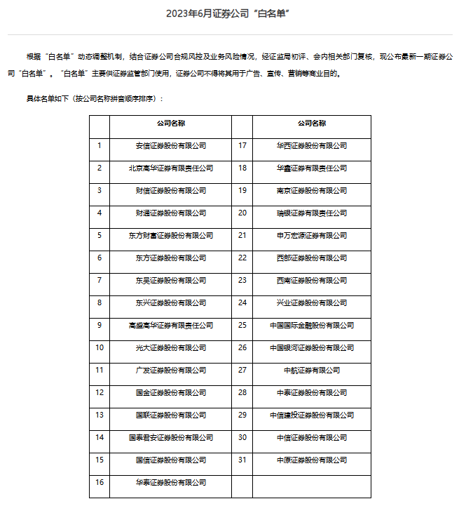 證監(jiān)會(huì)表示,“白名單”主要供證券監(jiān)管部門使用,證券公司不得將其用于廣告、宣傳、營(yíng)銷等商業(yè)目的。