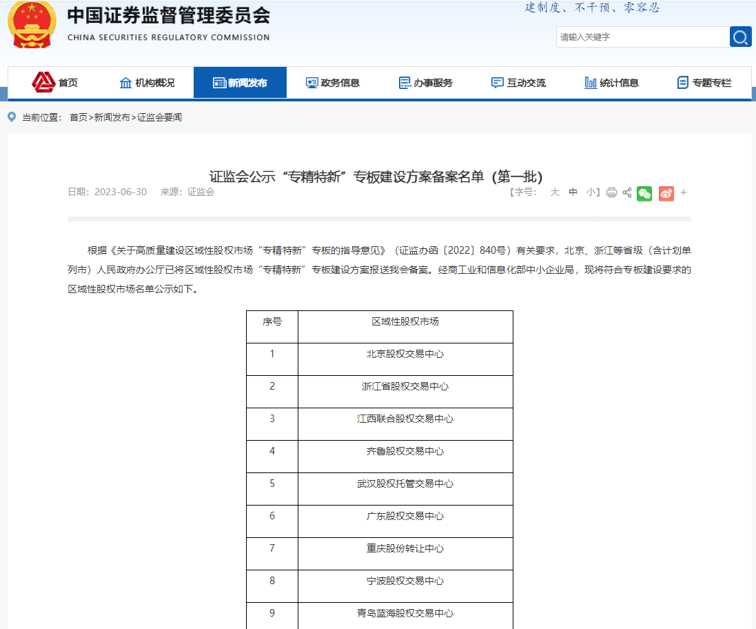 據證監(jiān)會網站6月30日消息,根據《關于高質量建設區(qū)域性股權市場“專精特新”專板的指導意見》(證監(jiān)辦函〔2022〕840號)有關要求,北京、浙江等省級(含計劃單列市)人民政府辦公廳已將區(qū)域性股權市場“專精特新”專板建設方案報送證監(jiān)會備案。