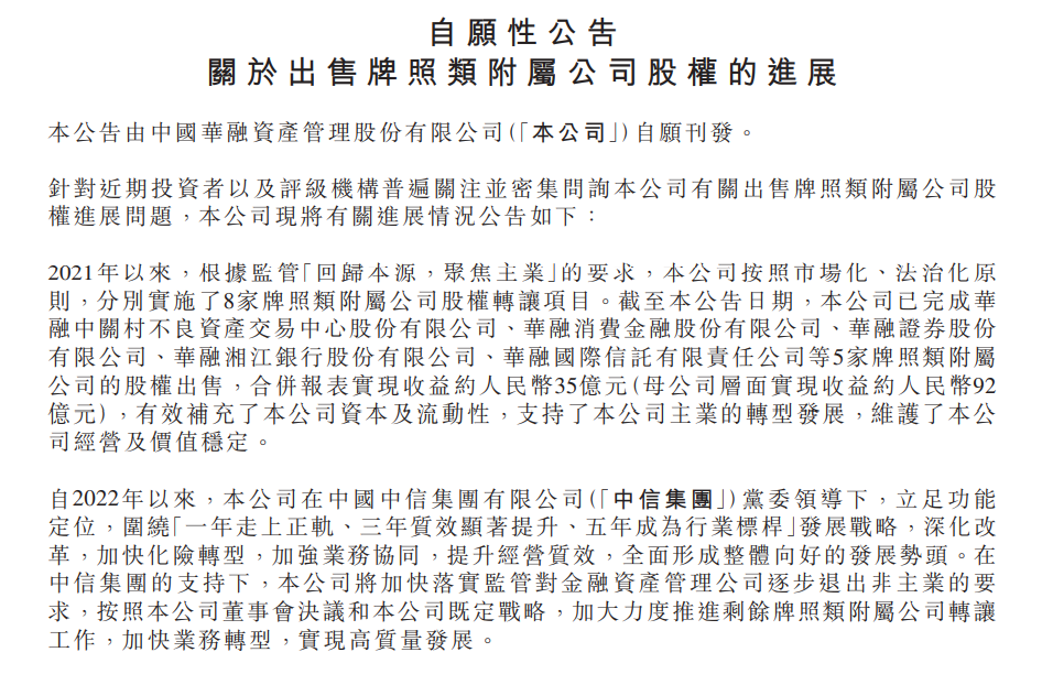 中國華融發(fā)布的另一則公告顯示,中國華融目前已完成華融中關(guān)村不良資產(chǎn)交易中心股份有限公司、華融消費(fèi)金融股份有限公司、華融證券股份有限公司、華融湘江銀行股份有限公司、華融國際信托有限責(zé)任公司等5家牌照類附屬公司的股權(quán)出售,合并報表實現(xiàn)收益約人民幣35億元(母公司層面實現(xiàn)收益約人民幣92億元)。