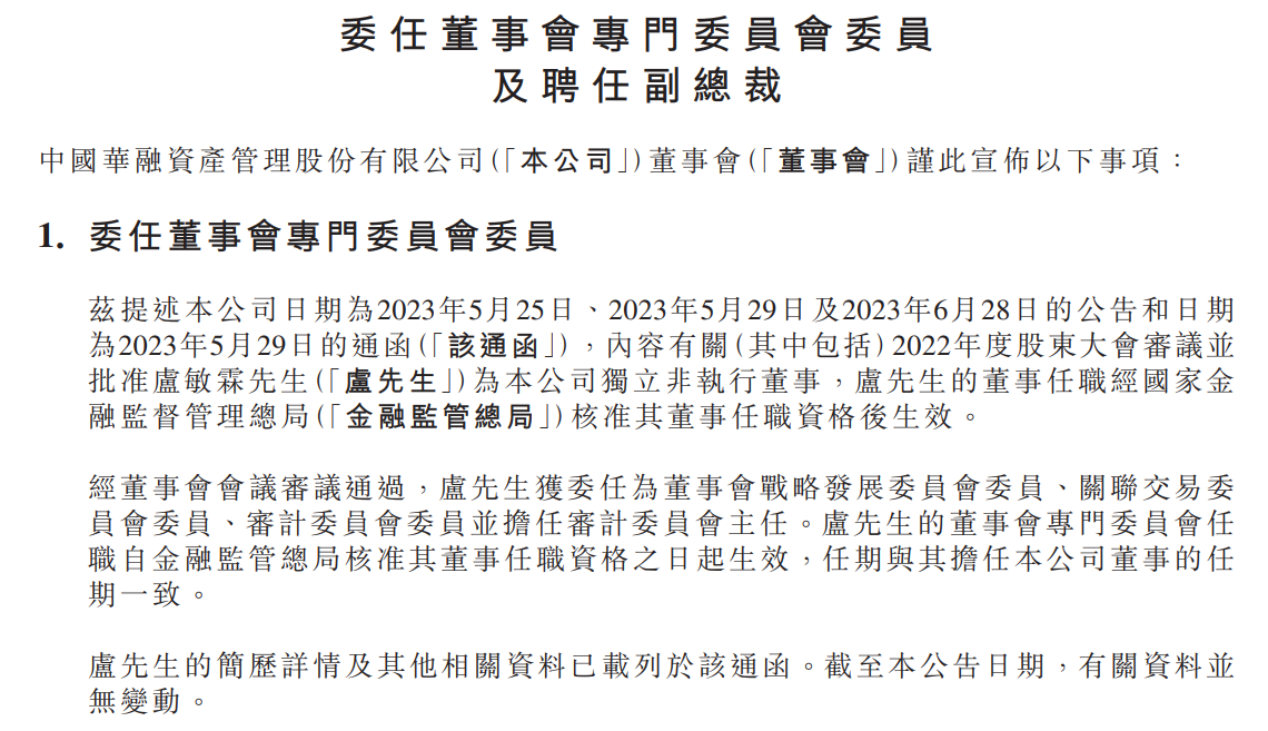此外,中國華融還發(fā)布了高管變更公告,公告顯示,盧敏霖獲委任為董事會戰(zhàn)略發(fā)展委員會委員、關(guān)聯(lián)交易委員會委員、審計委員會委員并擔(dān)任審計委員會主任。徐炯煒獲聘任為中國華融副總裁,其任期自金融監(jiān)管總局核準(zhǔn)相關(guān)任職資格之日起,至董事會另聘或解聘時止。