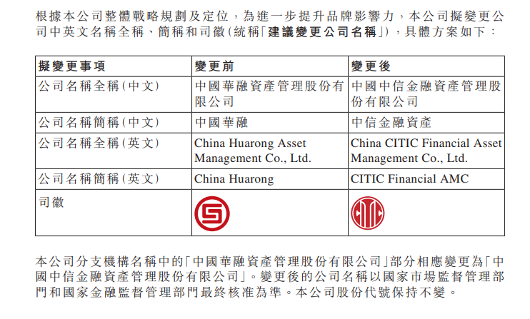 中國華融公告稱,根據(jù)該公司整體戰(zhàn)略規(guī)劃及定位,為進(jìn)一步提升品牌影響力,擬變更公司名稱為“中國中信金融資產(chǎn)管理股份有限公司”,簡稱“中信金融資產(chǎn)”。