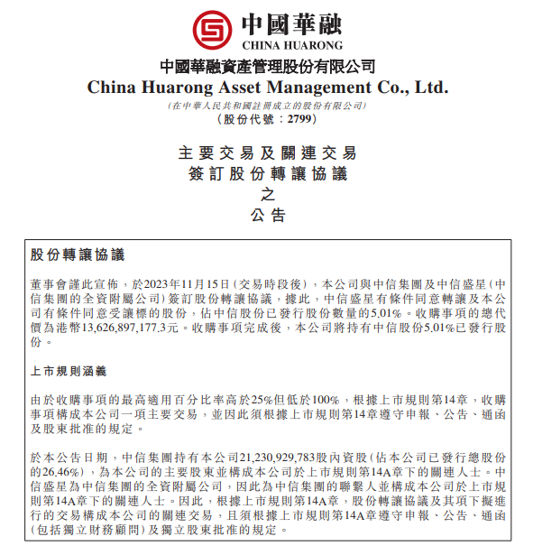 同時,中國華融發(fā)布公告稱,11月15日,該公司與中信集團(tuán)及其全資子公司中信盛星簽訂股份轉(zhuǎn)讓協(xié)議,將以136.27億港元(每股收購價為9.35港元)收購中信股份已發(fā)行股份數(shù)量的5.01%。收購事項完成后,中國華融將持有中信股份5.01%已發(fā)行股份。