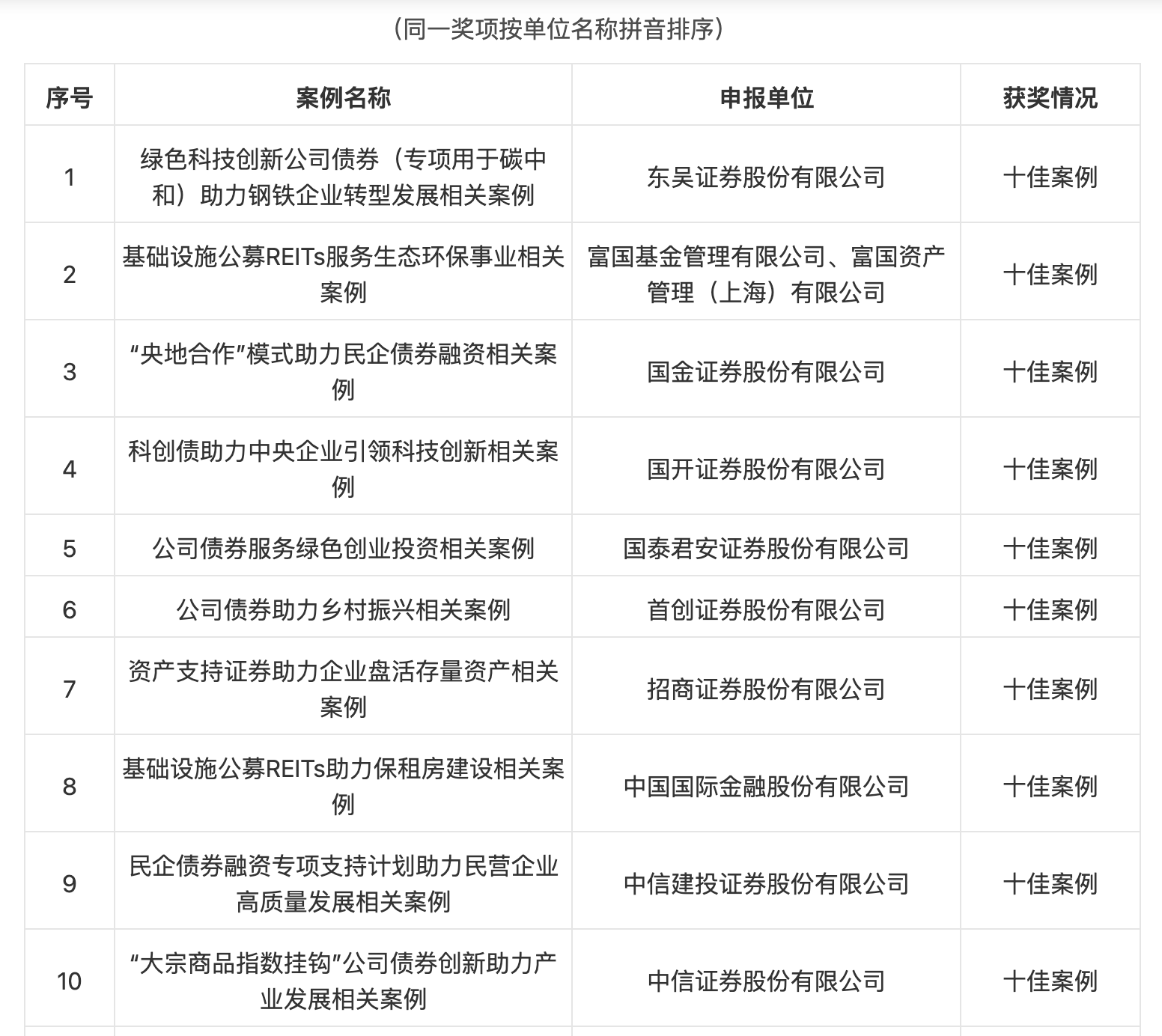 滬深證券交易所組織證券業(yè)協(xié)會、基金業(yè)協(xié)會、行業(yè)專家等成立評審組,經(jīng)過3輪評審,擇優(yōu)評選出一批標志性、引領(lǐng)性、示范性、創(chuàng)新性的典型案例,包括10個“十佳案例”和30個“優(yōu)秀案例”。