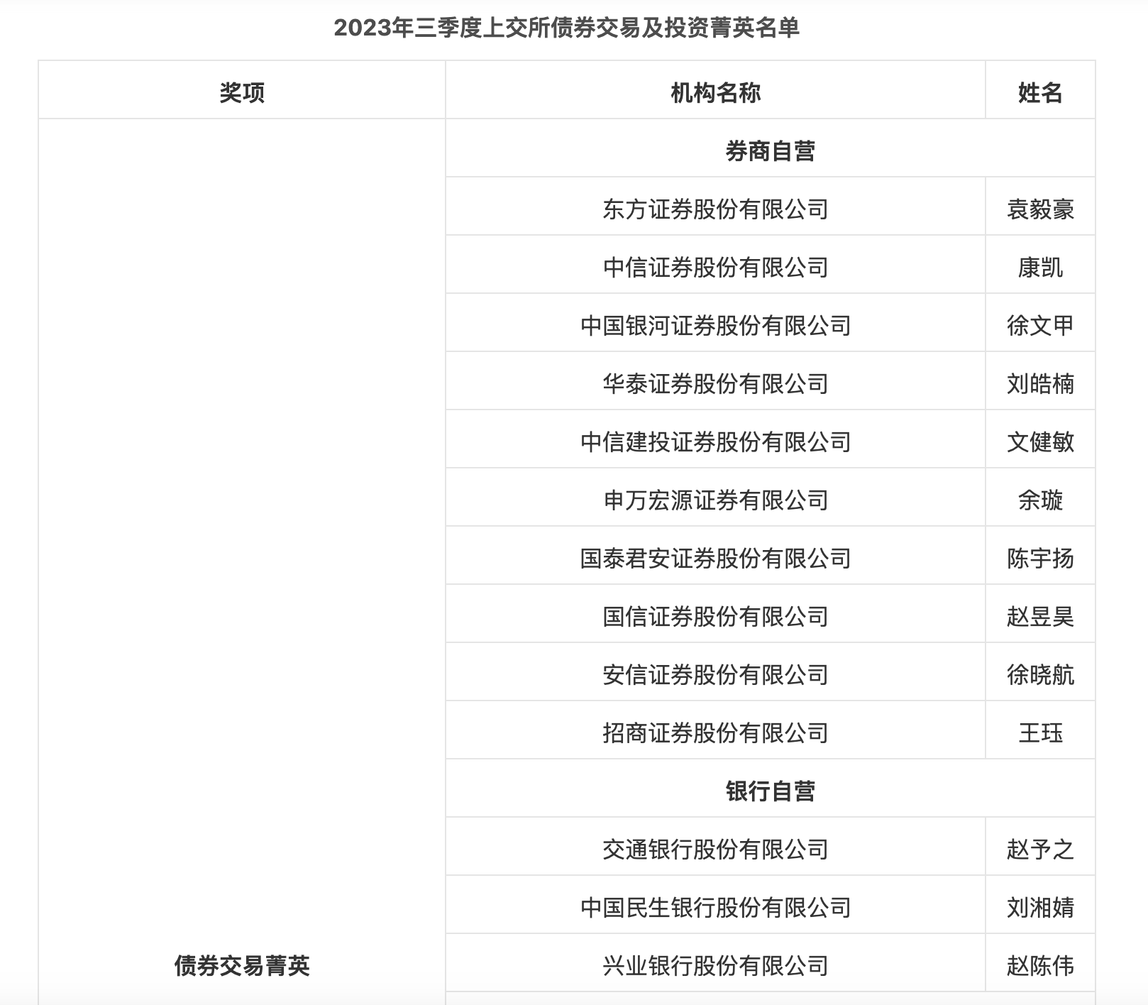 為鼓勵(lì)市場(chǎng)機(jī)構(gòu)積極參與債券投資交易、做市業(yè)務(wù)及創(chuàng)新業(yè)務(wù),推動(dòng)交易所債券買方市場(chǎng)建設(shè),2023年第三季度,上交所持續(xù)開展債券交易及投資菁英排名活動(dòng),共評(píng)選出16類獎(jiǎng)項(xiàng)。