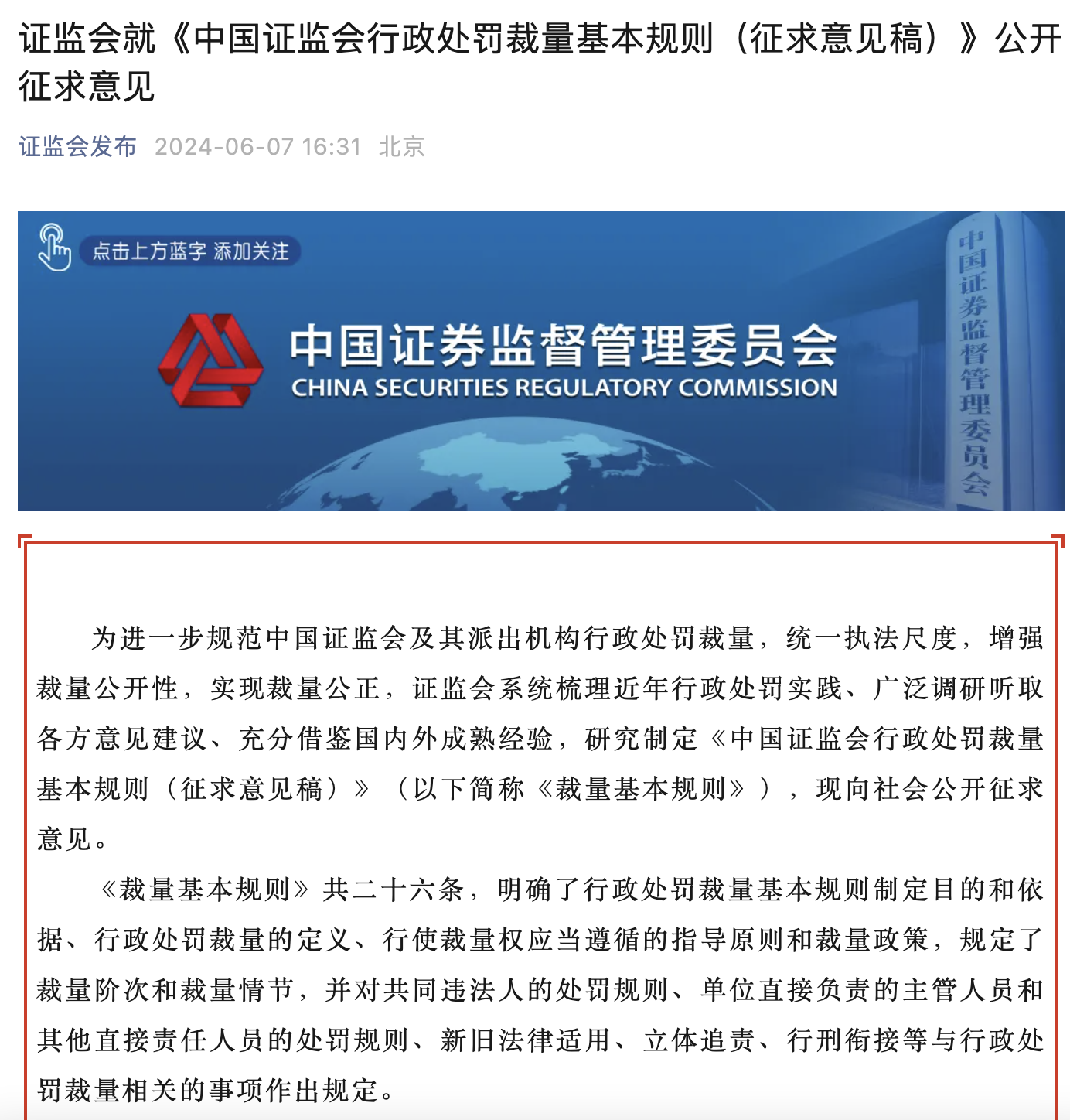 6月7日,證監(jiān)會表示,為進一步規(guī)范中國證監(jiān)會及其派出機構行政處罰裁量,統(tǒng)一執(zhí)法尺度,增強裁量公開性,實現裁量公正,證監(jiān)會系統(tǒng)梳理近年行政處罰實踐、廣泛調研聽取各方意見建議、充分借鑒國內外成熟經驗,研究制定《中國證監(jiān)會行政處罰裁量基本規(guī)則(征求意見稿)》(以下簡稱《裁量基本規(guī)則》),向社會公開征求意見。