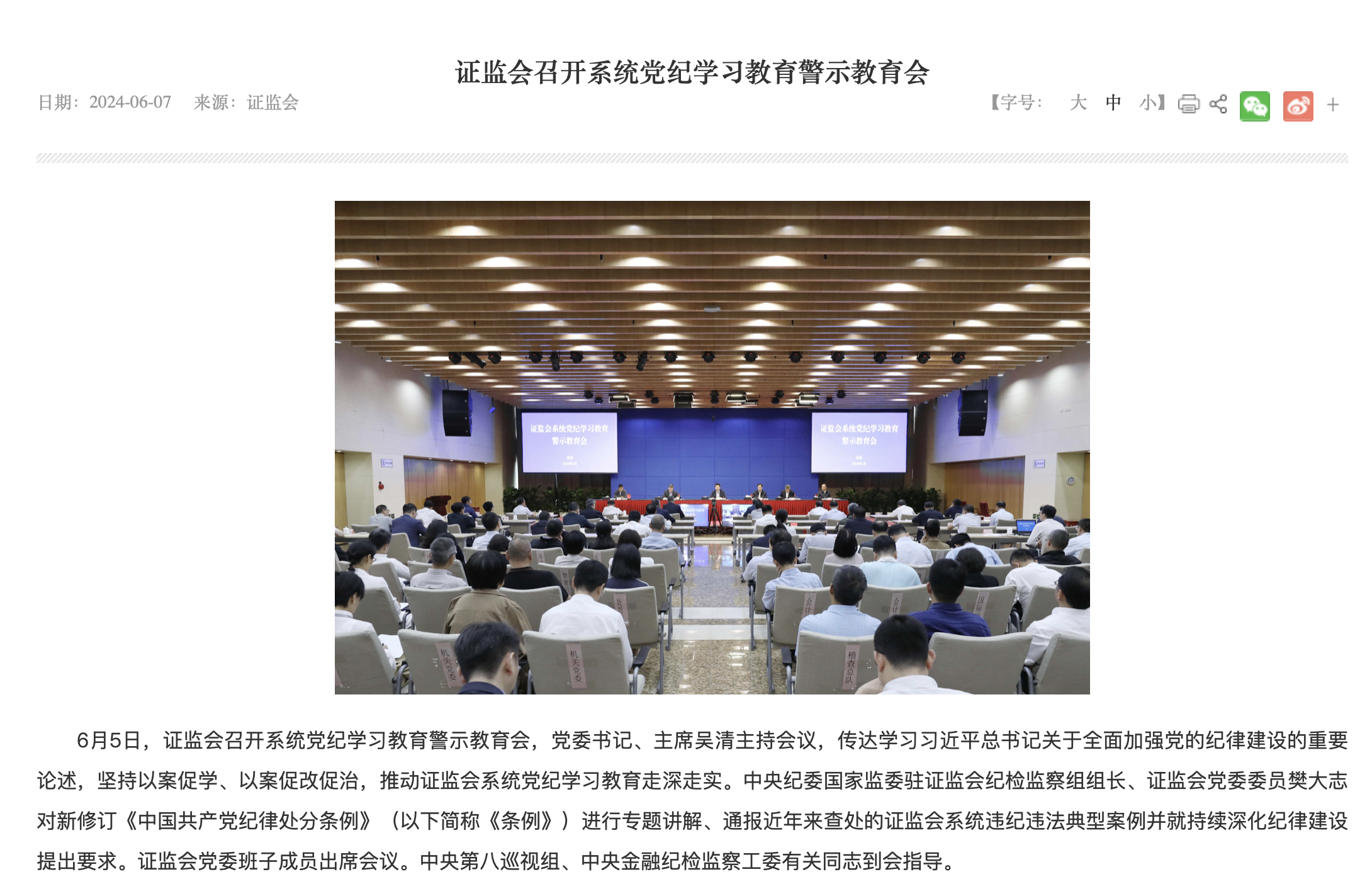 據(jù)證監(jiān)會(huì)網(wǎng)站6月7日消息,證監(jiān)會(huì)于6月5日召開(kāi)系統(tǒng)黨紀(jì)學(xué)習(xí)教育警示教育會(huì),證監(jiān)會(huì)黨委書(shū)記、主席吳清主持會(huì)議,傳達(dá)學(xué)習(xí)習(xí)近平總書(shū)記關(guān)于全面加強(qiáng)黨的紀(jì)律建設(shè)的重要論述,堅(jiān)持以案促學(xué)、以案促改促治,推動(dòng)證監(jiān)會(huì)系統(tǒng)黨紀(jì)學(xué)習(xí)教育走深走實(shí)。