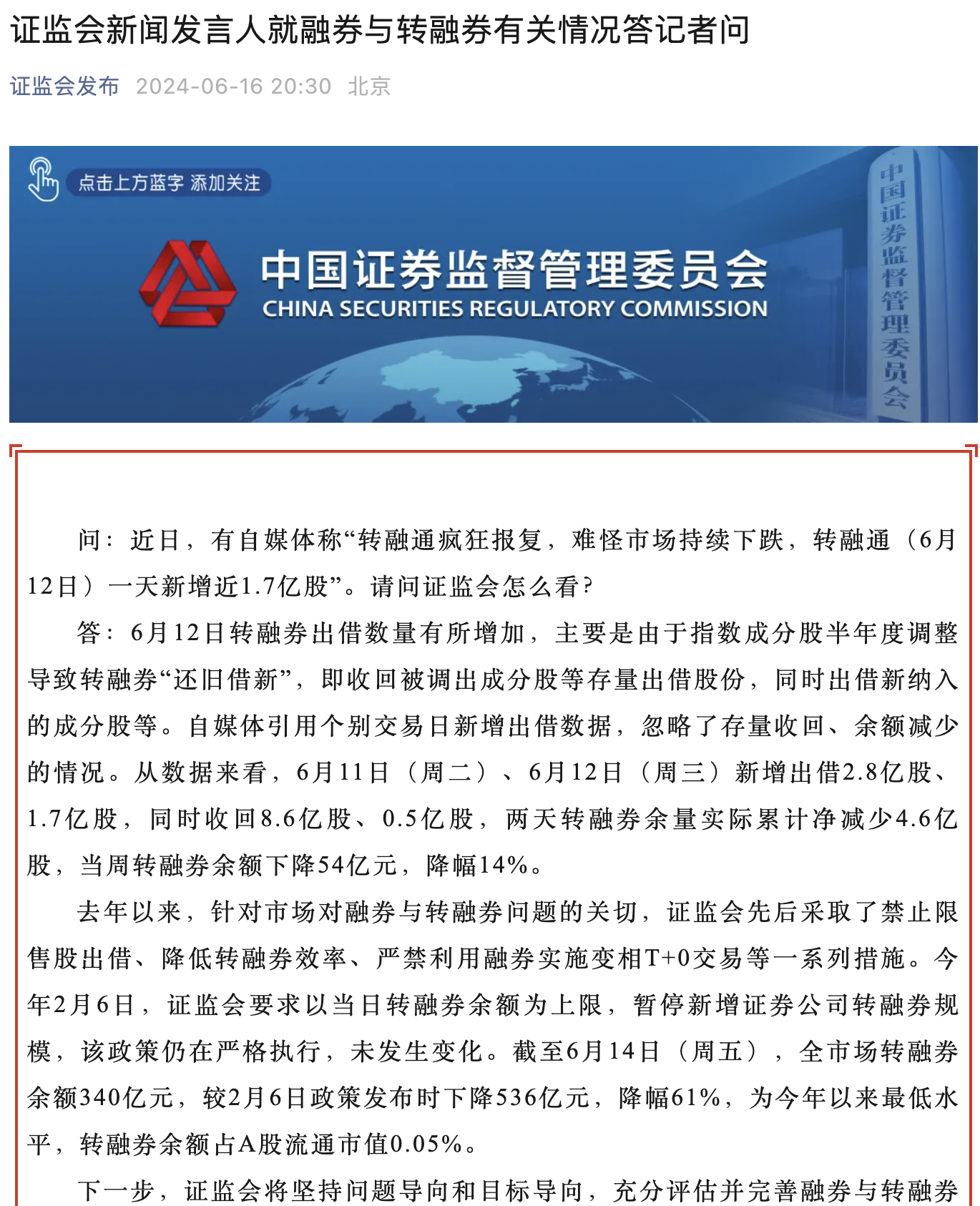 對此,6月16日,證監(jiān)會新聞發(fā)言人答記者問時表示,6月12日轉(zhuǎn)融券出借數(shù)量有所增加,主要是由于指數(shù)成分股半年度調(diào)整導(dǎo)致轉(zhuǎn)融券“還舊借新”,即收回被調(diào)出成分股等存量出借股份,同時出借新納入的成分股等。
