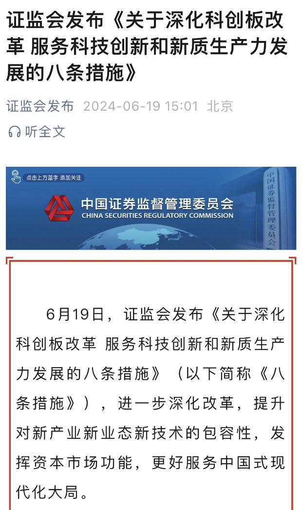 6月19日,證監(jiān)會發(fā)布《關(guān)于深化科創(chuàng)板改革服務(wù)科技創(chuàng)新和新質(zhì)生產(chǎn)力發(fā)展的八條措施》(以下簡稱《八條措施》),進一步深化改革,提升對新產(chǎn)業(yè)新業(yè)態(tài)新技術(shù)的包容性,發(fā)揮資本市場功能,更好服務(wù)中國式現(xiàn)代化大局。