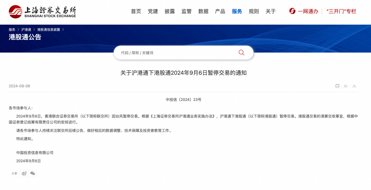 9月6日,港交所發(fā)布八號臺風信號生效下證券及衍生產品市場的交易安排。同日,滬深交易所公告,港股通暫停今日交易。