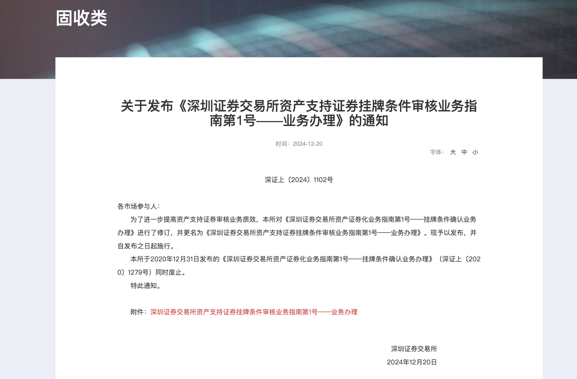 12月20日,深交所發(fā)布《深圳證券交易所資產(chǎn)支持證券掛牌條件審核業(yè)務(wù)指引第1號(hào)——申請(qǐng)文件及其編制要求》(以下簡(jiǎn)稱《申請(qǐng)文件及其編制要求指引》)等六項(xiàng)資產(chǎn)支持證券審核業(yè)務(wù)指引,推動(dòng)構(gòu)建更加“簡(jiǎn)明清晰、易懂好用、全面完備”的規(guī)則體系。