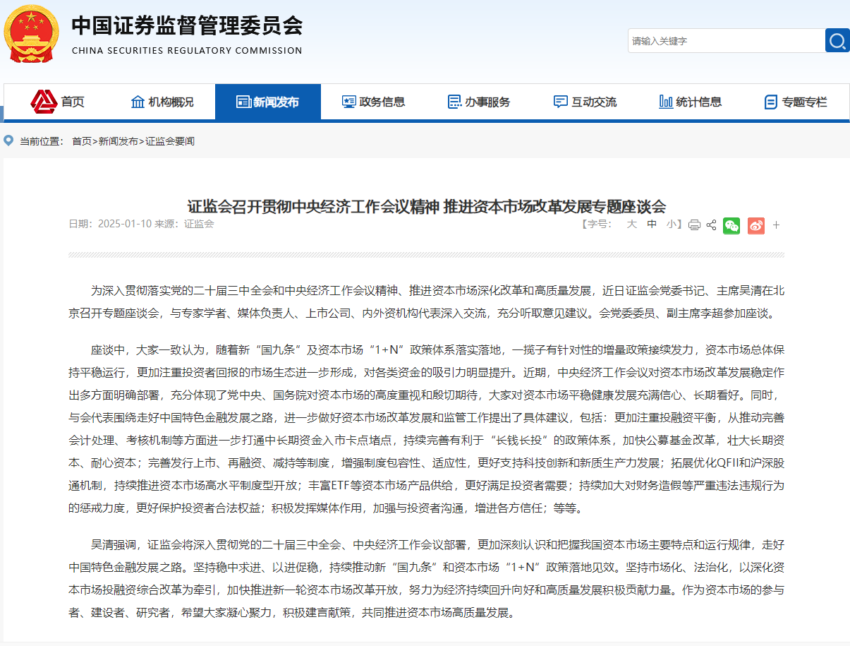 據(jù)證監(jiān)會(huì)網(wǎng)站1月10日消息,為深入貫徹落實(shí)黨的二十屆三中全會(huì)和中央經(jīng)濟(jì)工作會(huì)議精神、推進(jìn)資本市場(chǎng)深化改革和高質(zhì)量發(fā)展,近日證監(jiān)會(huì)黨委書記、主席吳清在北京召開專題座談會(huì),與專家學(xué)者、媒體負(fù)責(zé)人、上市公司、內(nèi)外資機(jī)構(gòu)代表深入交流,充分聽取意見建議。證監(jiān)會(huì)黨委委員、副主席李超參加座談。