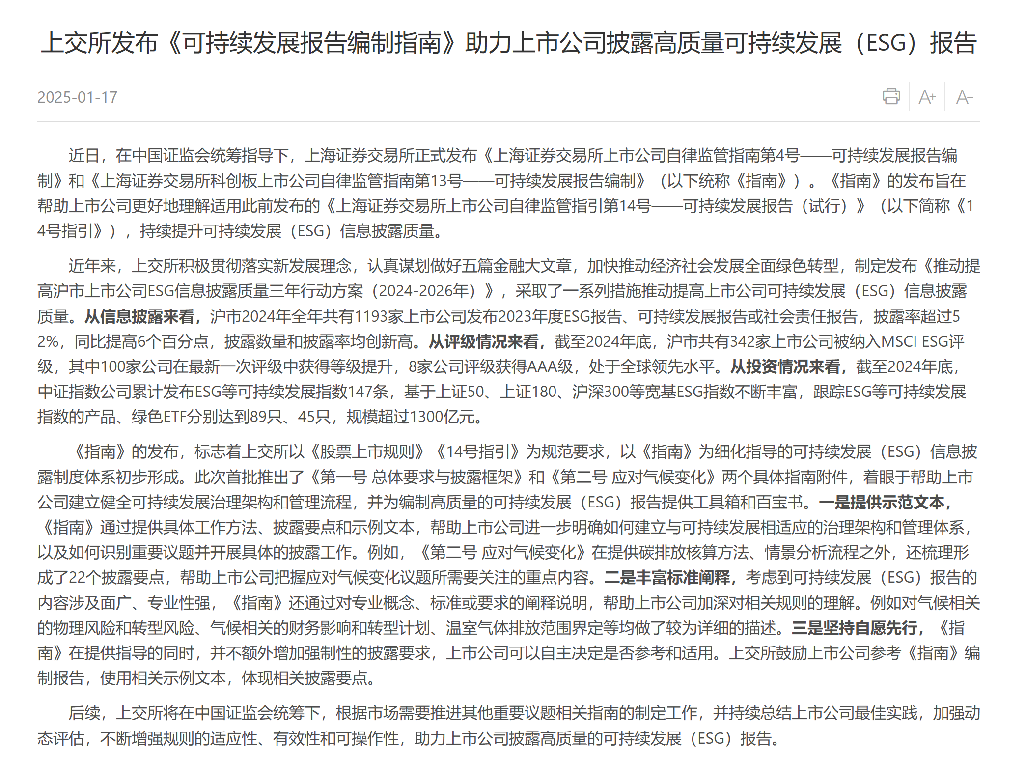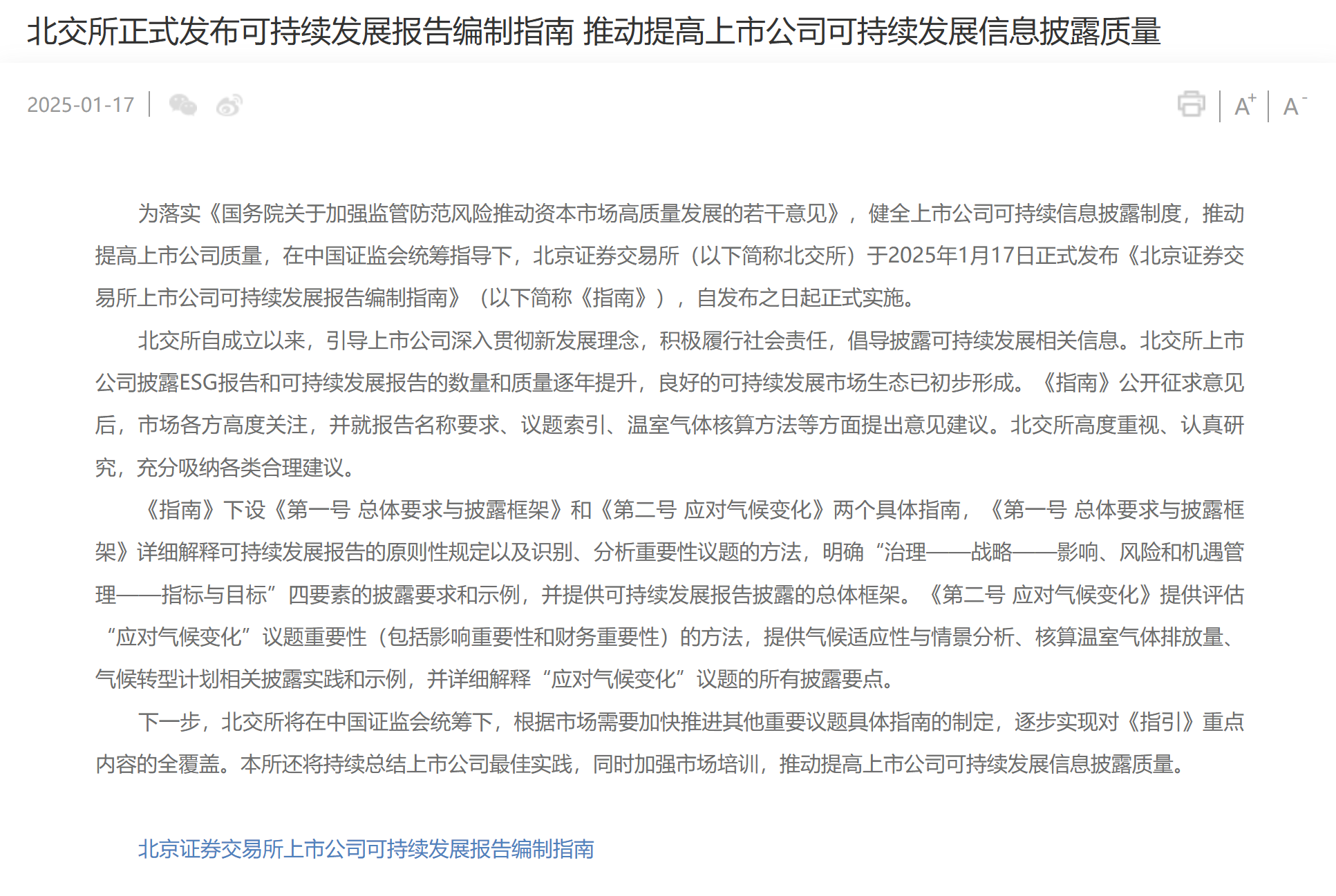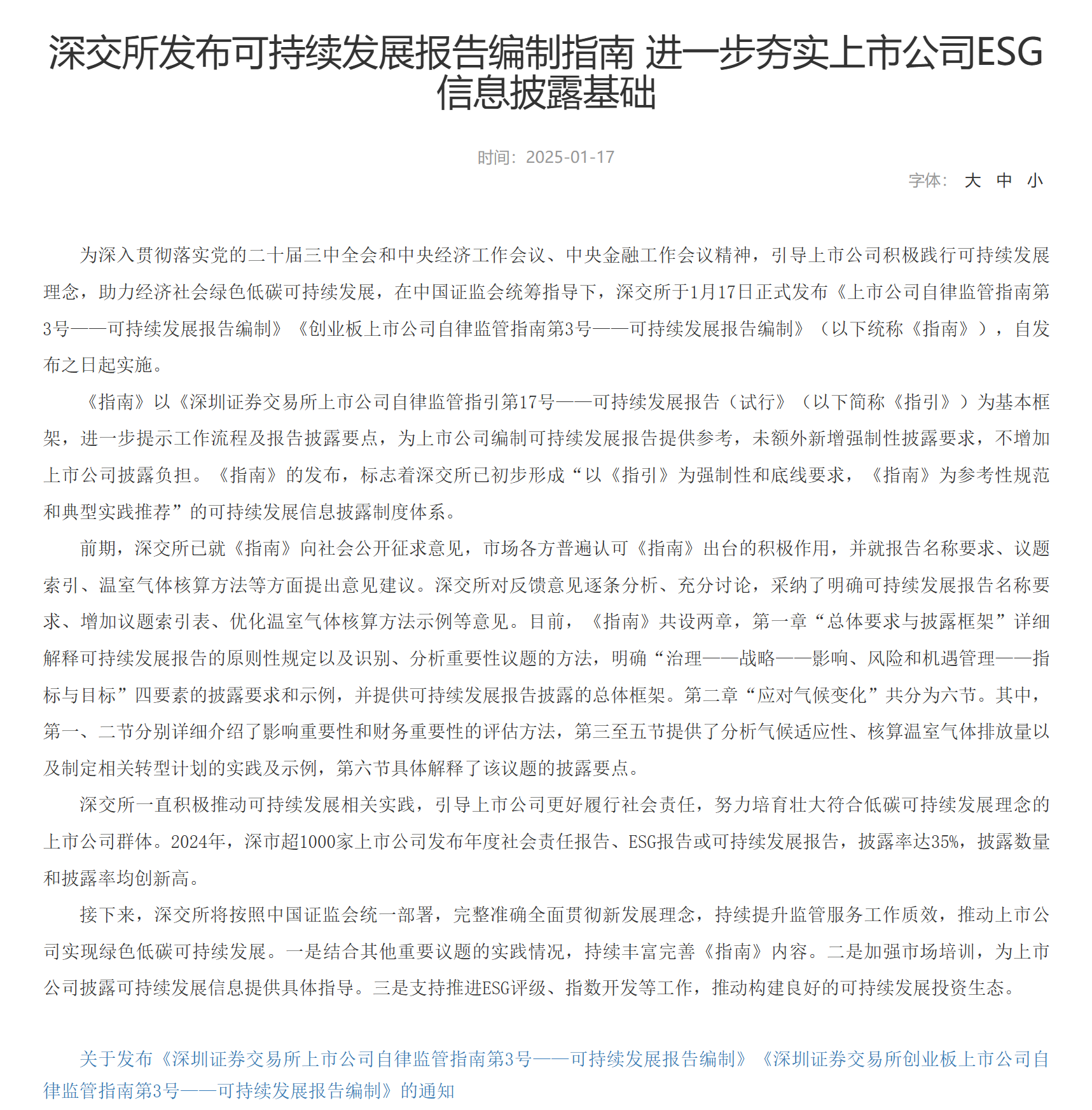 1月17日消息,為深入貫徹落實黨的二十屆三中全會和中央經(jīng)濟工作會議、中央金融工作會議精神,引導(dǎo)上市公司積極踐行可持續(xù)發(fā)展理念,助力經(jīng)濟社會綠色低碳可持續(xù)發(fā)展,在中國證監(jiān)會統(tǒng)籌指導(dǎo)下,滬深北交易所正式發(fā)布《上海證券交易所上市公司自律監(jiān)管指南第4號——可持續(xù)發(fā)展報告編制》《上海證券交易所科創(chuàng)板上市公司自律監(jiān)管指南第13號——可持續(xù)發(fā)展報告編制》;《深圳證券交易所上市公司自律監(jiān)管指南第3號——可持續(xù)發(fā)展報告編制》《深圳證券交易所創(chuàng)業(yè)板上市公司自律監(jiān)管指南第3號——可持續(xù)發(fā)展報告編制》;《北京證券交易所上市公司可持續(xù)發(fā)展報告編制指南》(以下統(tǒng)稱《指南》),自發(fā)布之日起實施。