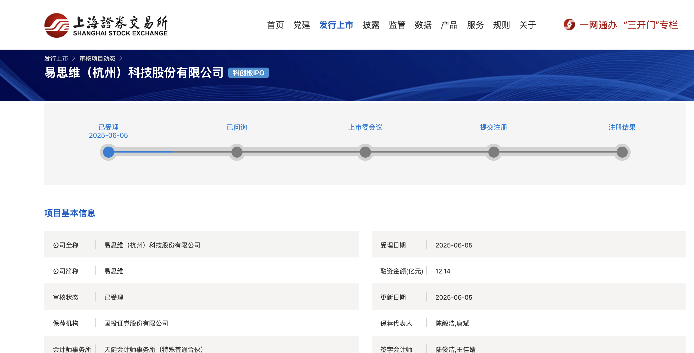 本報訊 (記者毛藝融)6月5日,上交所官網(wǎng)顯示,易思維(杭州)科技股份有限公司(以下簡稱“易思維”)在科創(chuàng)板上市的首發(fā)申請獲上交所受理,保薦機(jī)構(gòu)為國投證券。這是上交所6月份受理的首家科創(chuàng)板IPO企業(yè),也是今年上交所受理的第4家科創(chuàng)板IPO企業(yè)。