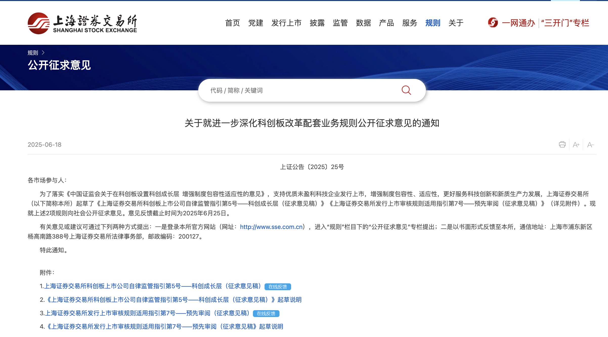 本報訊 (記者毛藝融)6月18日,中國證監(jiān)會印發(fā)了《關(guān)于在科創(chuàng)板設(shè)置科創(chuàng)成長層 增強制度包容性適應(yīng)性的意見》(以下簡稱《科創(chuàng)板意見》),上海證券交易所(以下簡稱“上交所”)就同步制訂的2項配套業(yè)務(wù)規(guī)則《上海證券交易所科創(chuàng)板上市公司自律監(jiān)管指引第5號——科創(chuàng)成長層(征求意見稿)》《上海證券交易所發(fā)行上市審核規(guī)則適用指引第7號——預(yù)先審閱(征求意見稿)》公開征求意見。意見反饋截止時間為2025年6月25日。