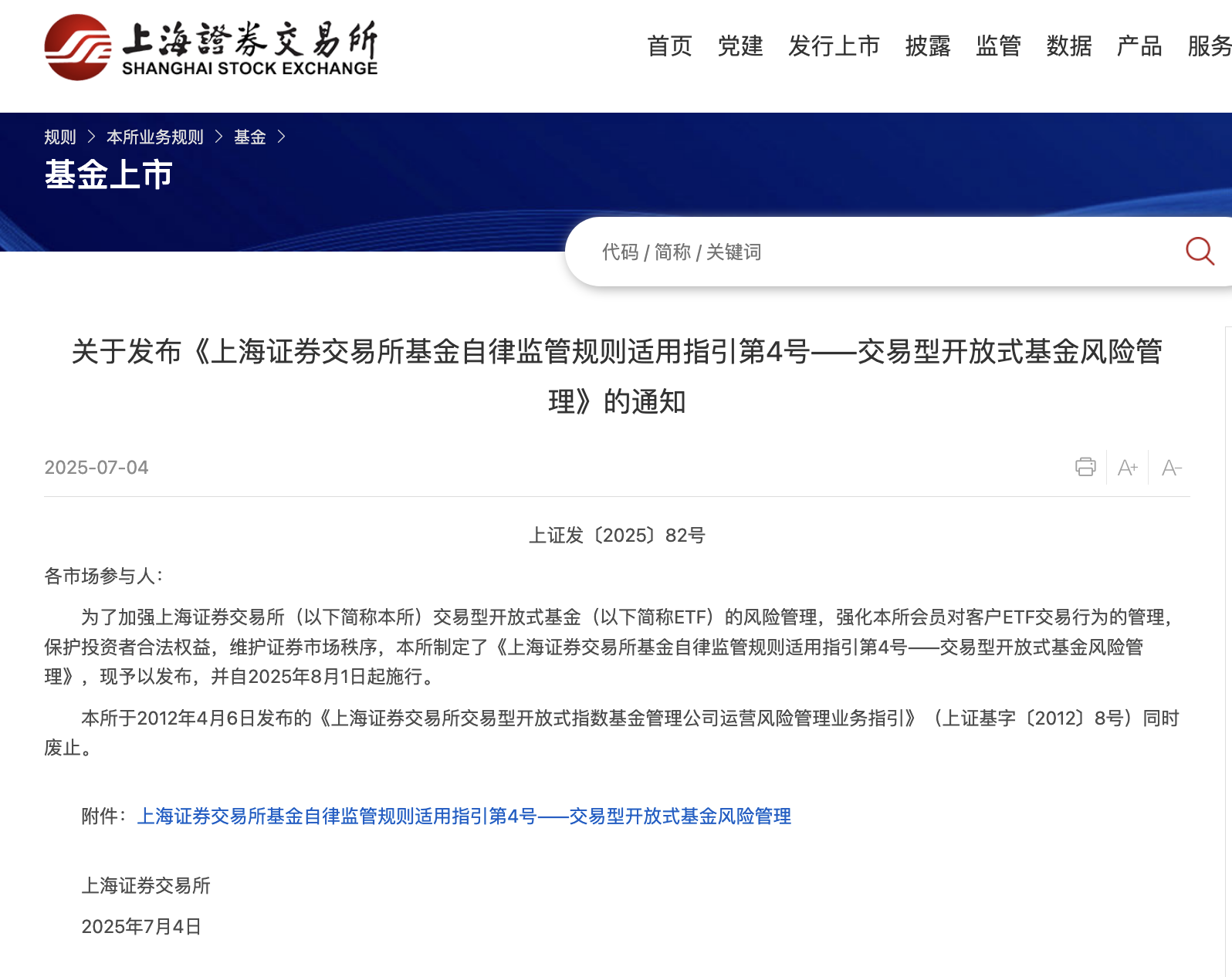 本報訊 (記者毛藝融)7月4日,記者從上海證券交易所獲悉,上交所修訂并發(fā)布《上海證券交易所基金自律監(jiān)管規(guī)則適用指引第4號——交易型開放式基金風險管理》(以下簡稱《ETF風險管理指引》)。這是貫徹落實中國證監(jiān)會《促進資本市場指數(shù)化投資高質(zhì)量發(fā)展行動方案》,強化ETF風險管理,更好保護投資者合法權(quán)益的重要舉措。