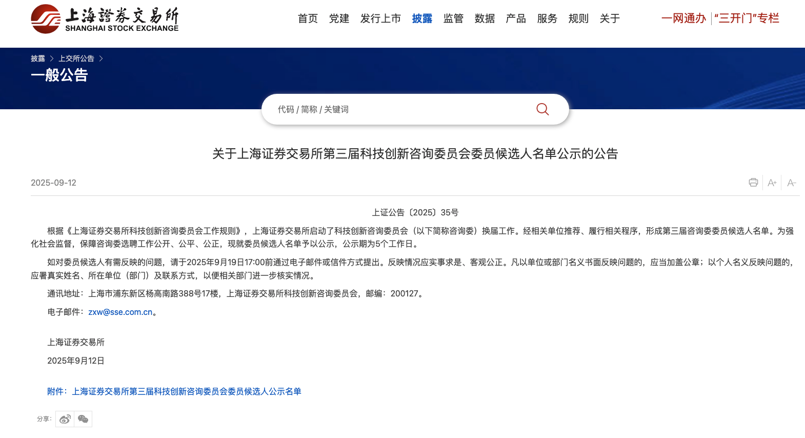 圖注:上海證券交易所第三屆科技創(chuàng)新咨詢委員會(huì)委員候選人公示名單