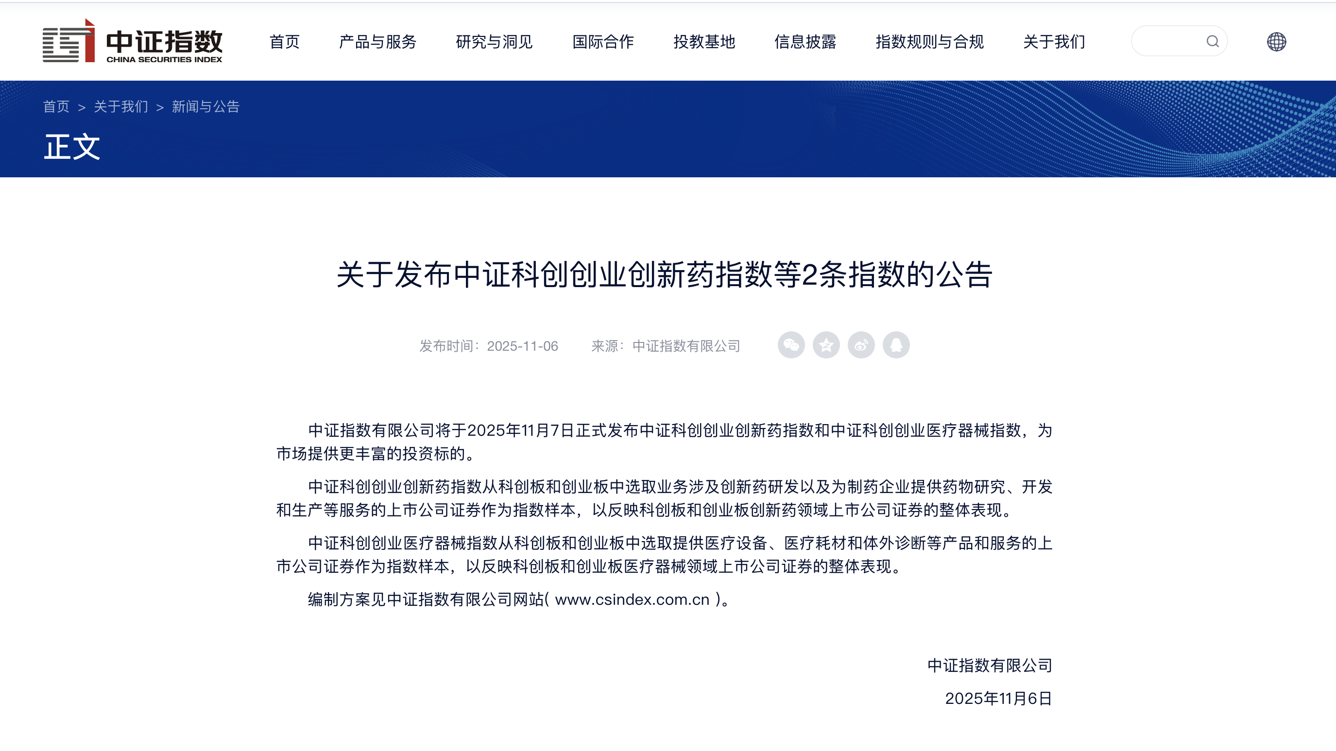 本報(bào)訊 (記者毛藝融)11月6日,中證指數(shù)有限公司公告稱,將于2025年11月7日正式發(fā)布中證科創(chuàng)創(chuàng)業(yè)創(chuàng)新藥指數(shù)和中證科創(chuàng)創(chuàng)業(yè)醫(yī)療器械指數(shù),為市場提供更豐富的投資標(biāo)的。