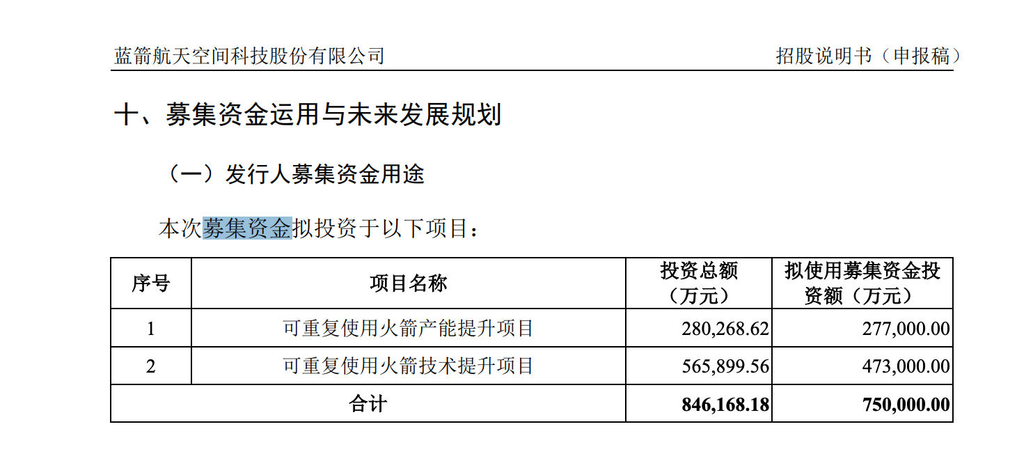 招股書申報稿顯示,藍箭航天IPO擬募資75億元。藍箭航天表示,通過本次上市募集資金,大力提升公司可重復使用火箭技術研發(fā)、提高發(fā)動機與火箭批量化制造能力,充分發(fā)揮自身在火箭設計、研發(fā)、試驗、生產(chǎn)總裝、發(fā)射的全鏈條交付能力,實現(xiàn)低成本、大運力、可重復使用火箭的商業(yè)化運營,積極響應國家戰(zhàn)略規(guī)劃與迫切的發(fā)射服務市場需求。