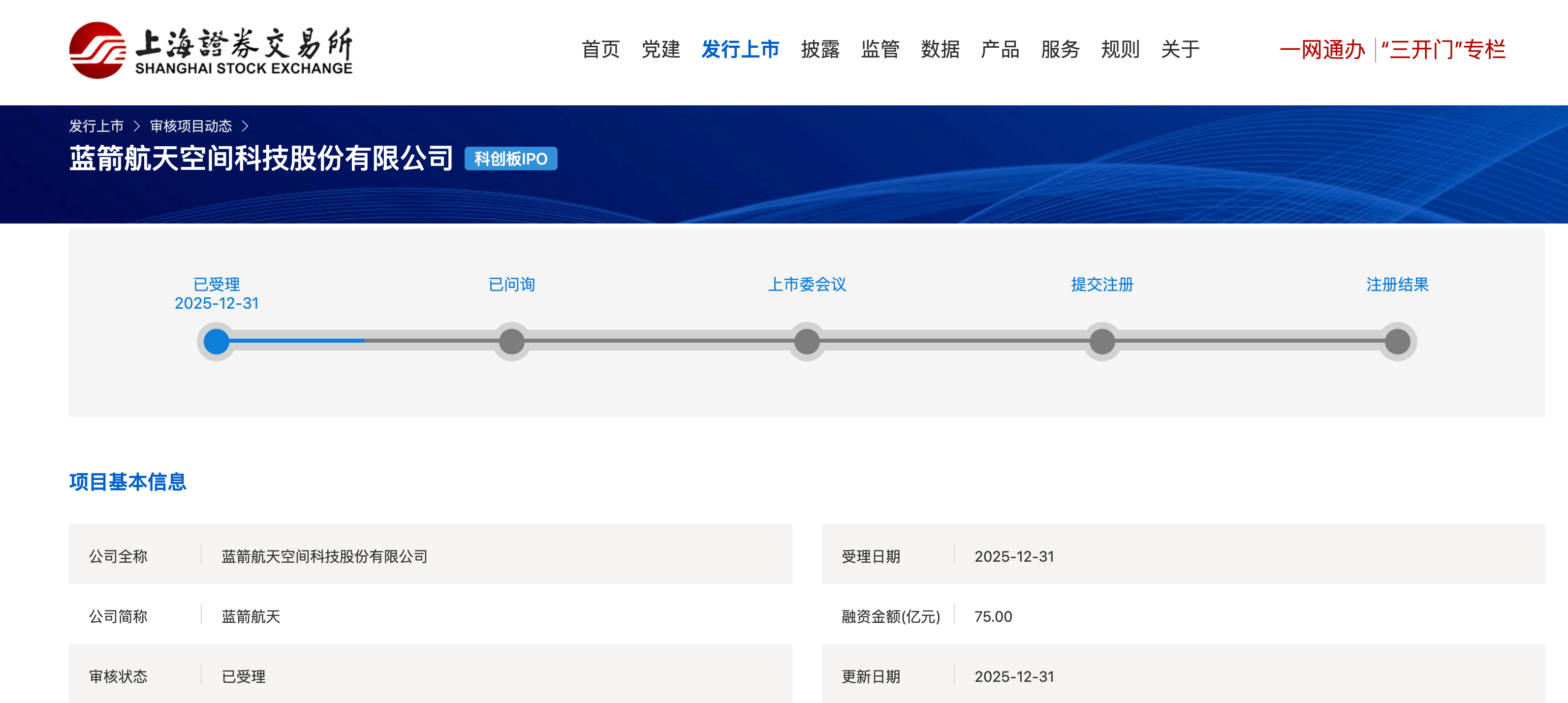 本報訊 (記者毛藝融)2025年12月31日,上交所官網(wǎng)信息顯示,藍箭航天空間科技股份有限公司(簡稱“藍箭航天”)科創(chuàng)板IPO申請獲受理,正式?jīng)_刺科創(chuàng)板“商業(yè)火箭第一股”。
