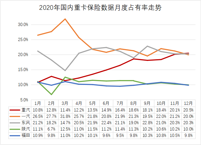 《證券日報》記者獲悉,2020年12月份,中國重汽重卡保險數(shù)達到25848輛,市場占有率達到20.5%,超過一汽、東風、陜汽及福田等主要商用車企業(yè),成為國內重卡銷量當月最高的企業(yè)??v觀2020年全年,中國重汽市場占有率大幅提升,特別是3月份以后,隨著產品調整到位,公司產品市占率平均每月上升1個百分點。