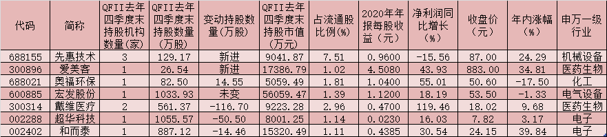 新進(jìn)增持方面,截至2020年四季度末,QFII新進(jìn)先惠技術(shù)、愛美客等2只個(gè)股,持股數(shù)量分別為129.17萬股、26.54萬股,并對(duì)奧福環(huán)保進(jìn)行繼續(xù)加倉操作,QFII增持?jǐn)?shù)量為14.55萬股,最新持股數(shù)量為82.50萬股。