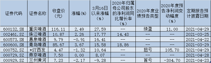 截至4月8日,已有5家啤酒行業(yè)上市公司披露2020年年報(bào)或年度業(yè)績(jī)預(yù)告,2020年凈利潤(rùn)實(shí)現(xiàn)或有望實(shí)現(xiàn)同比增長(zhǎng)的公司達(dá)到4家。