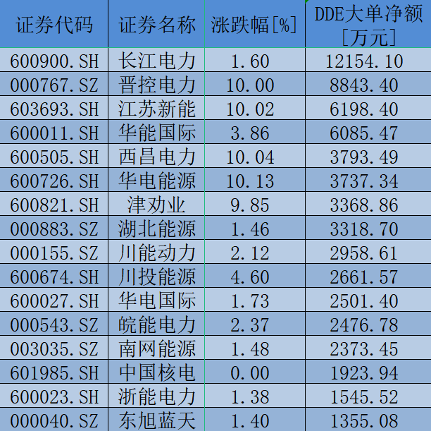 電力板塊的上漲也吸引了資金的追捧。同花順數(shù)據(jù)顯示,今日共有38只個股受到大單資金青睞。其中,長江電力的大單資金凈流入額達到12154.10萬元;另外,包括晉控電力(8843.40萬元)、江蘇新能(6198.40萬元)、華能國際(6085.47萬元)、西昌電力(3793.49萬元)、華電能源(3737.34萬元)等在內(nèi)的15只個股的大單資金凈流入額也超過1000萬元。