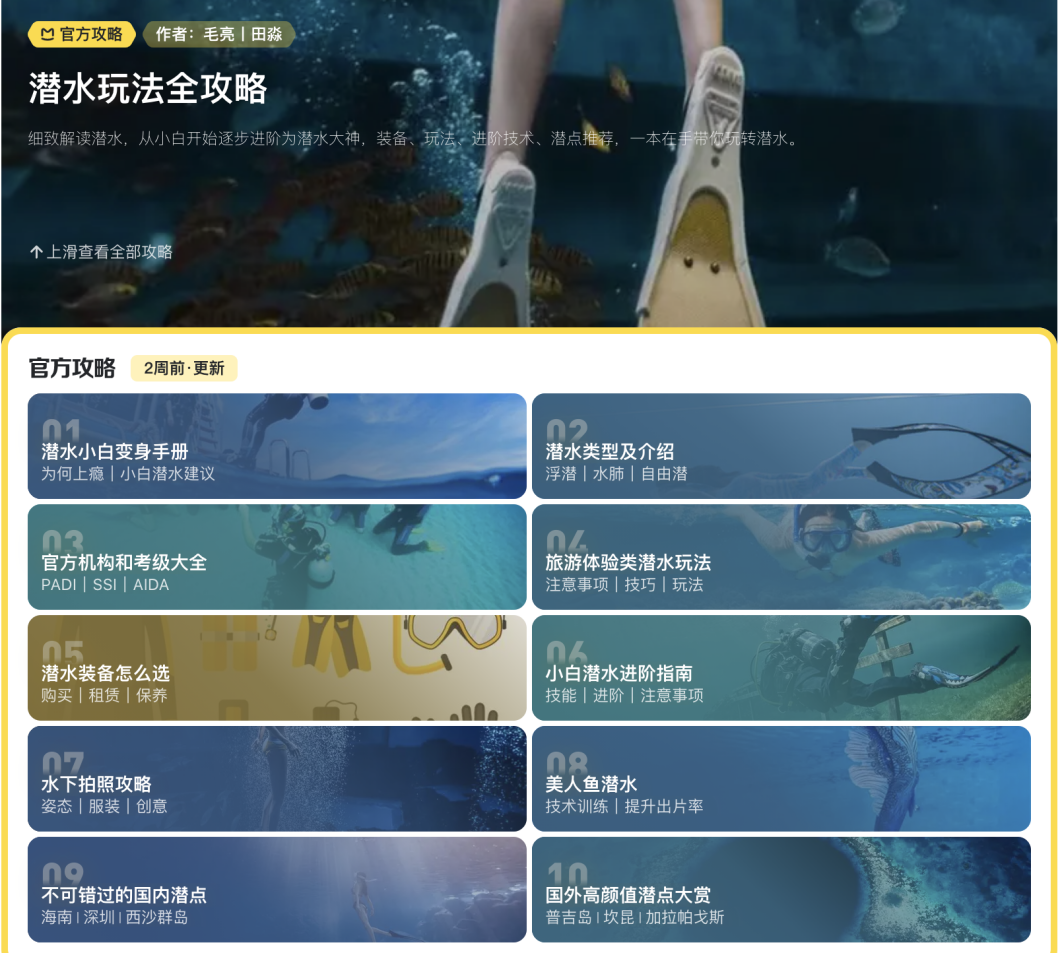 “北極星攻略”是馬蜂窩推出的一站式系統(tǒng)化旅游攻略,用全面、及時和準確的信息解決游客旅行前后關(guān)心的問題,并且用精選思維進行旅行玩樂產(chǎn)品的篩選。馬蜂窩的北極星攻略也專門為潛水、滑雪、馬拉松等運動項目建立了專屬攻略,需要哪些準備工作、國內(nèi)優(yōu)質(zhì)簽點、考證必備知識等實用信息一應(yīng)俱全,通過一站式信息島幫助游客輕松入門‘小眾’運動。