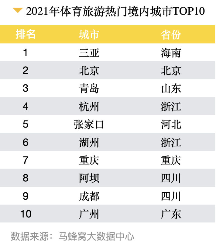 在2021年體育旅游熱門境內(nèi)城市Top10榜單上,因疫情導(dǎo)致的境外游受限,卻讓以往熱衷境外體育游人群紛紛將目光轉(zhuǎn)向境內(nèi)目的地,潛水、沖浪、浮潛、滑翔傘等曾經(jīng)的境外海島游熱門玩法,使三亞迅速躥升至境內(nèi)體育旅游熱門目的地Top1。北京憑借2022年冬奧會舉辦地的優(yōu)勢位列熱門城市第二名,青島則憑借帆船體驗、出??慈章湮购zt、海釣等體育游樂項目位居第三,奧林匹克帆船中心、奧運帆船博物館均是熱門景點。