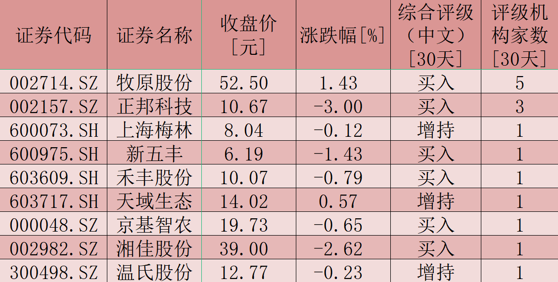 表:最近30日內(nèi),豬肉板塊獲機構(gòu)給予“買入”或“增持”等看好評級個股一覽