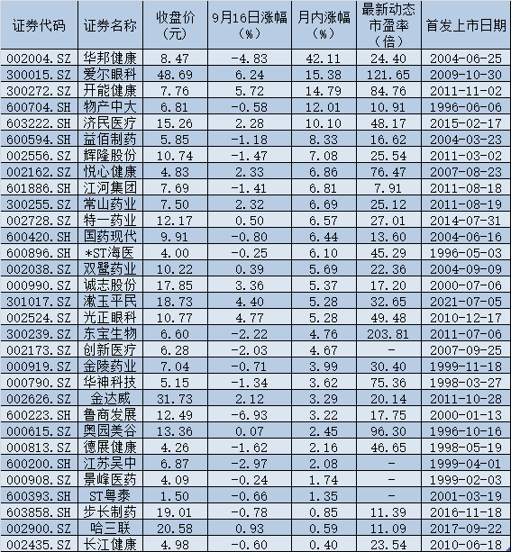 在9月份以來的這波反彈中,醫(yī)美股的分化趨勢已有所體現(xiàn),期間有31只醫(yī)美概念股呈現(xiàn)不同程度的上漲,占行業(yè)內成份股比例為60.78%,華邦健康、愛爾眼科、開能健康、物產中大、濟民醫(yī)療等個股期間累計漲幅均在10%以上。反觀出現(xiàn)下跌的個股,超半數(shù)最新動態(tài)市盈率在50倍以上,國際醫(yī)學、愛美客、貝泰妮、華熙生物等4只個股最新動態(tài)市盈率均高于100倍。