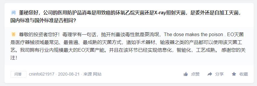 事實(shí)上,早在去年防疫物資大規(guī)模生產(chǎn)的時(shí)候,就有用戶向口罩生產(chǎn)商提出過(guò)類(lèi)似問(wèn)題:防護(hù)品消毒是用環(huán)氧乙烷滅菌還是X-ray照射滅菌?當(dāng)時(shí),一家上市公司的答復(fù)也很幽默:“毒理學(xué)有一句話,拋開(kāi)劑量談毒性就是耍流氓,EO(環(huán)氧乙烷)滅菌是醫(yī)療器械領(lǐng)域最常見(jiàn)、最普遍、最成熟的滅菌方式,諸如手術(shù)器材、輸液器之類(lèi)的產(chǎn)品都可以使用該滅菌工藝。”