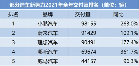 蔚來汽車方面,2021年共交付91429輛汽車,同比增長109.1%。截至2021年12月31日,ES8、ES6和EC6的累計交付量已達到167070輛;理想汽車方面,2021年的總交付90491輛汽車,同比增長177.4%。在2021年12月交付了14087輛汽車,同比增長130%。