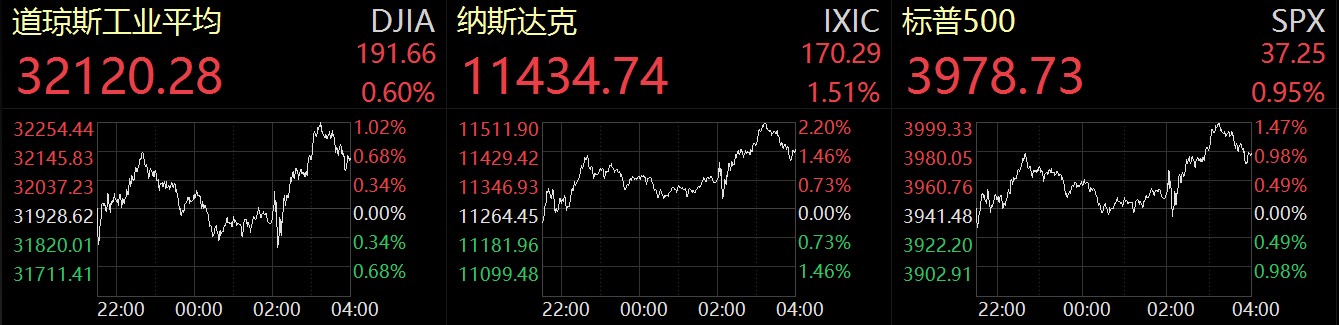 受此消息影響,當(dāng)?shù)貢r間5月25日,美股三大指數(shù)尾盤集體拉升,截至收盤,三大指數(shù)集體收漲,道瓊斯指數(shù)漲0.6%,報32120.28點(diǎn);標(biāo)普500指數(shù)漲0.95%,報3978.73點(diǎn);納斯達(dá)克指數(shù)漲1.51%,報11434.74點(diǎn)。