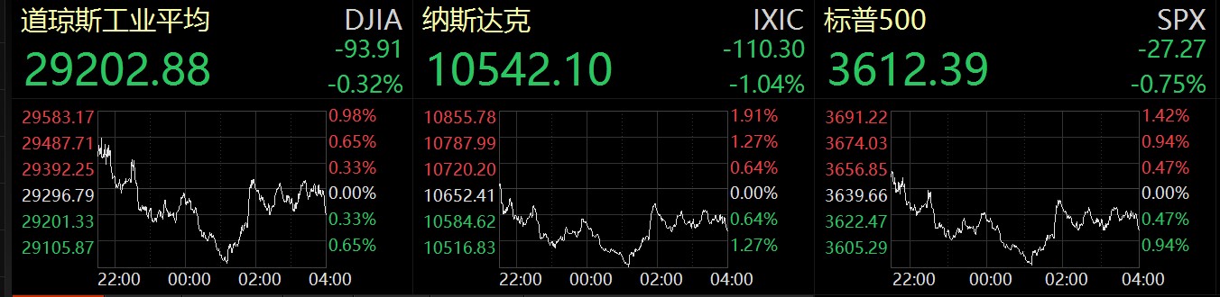 當(dāng)?shù)貢r(shí)間10月10日,美股市場(chǎng)延續(xù)下跌行情,截至收盤,美股三大指數(shù)集體收跌,為連續(xù)第四個(gè)交易日下跌,其中,道瓊斯指數(shù)跌0.32%,報(bào)29202.88點(diǎn);標(biāo)普500指數(shù)跌0.75%,報(bào)3612.39點(diǎn);納斯達(dá)克指數(shù)跌1.04%,報(bào)10542.10點(diǎn)?;仡檨?lái)看,近4個(gè)交易日,道瓊斯指數(shù)、標(biāo)普500指數(shù)、納斯達(dá)克指數(shù)期間分別累計(jì)下跌3.67%、4.71%、5.68%。