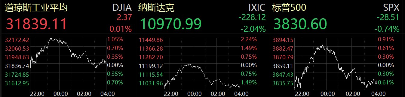 當(dāng)?shù)貢r(shí)間10月26日,美股三大指數(shù)收盤漲跌不一,其中,道瓊斯指數(shù)漲0.01%,報(bào)31839.11點(diǎn);標(biāo)普500指數(shù)跌0.74%,報(bào)3830.60點(diǎn);納斯達(dá)克指數(shù)跌2.04%,報(bào)10970.99點(diǎn)。其中,納斯達(dá)克指數(shù)和標(biāo)普500指數(shù)終結(jié)連續(xù)3個(gè)交易日的上漲行情。