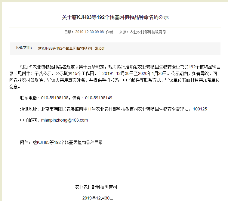 此外,在2019年12月30日,農(nóng)業(yè)農(nóng)村部科技教育司發(fā)布《關于慈KJH83等192個轉(zhuǎn)基因植物品種命名的公示》,擬批準為192個植物品種目錄頒發(fā)農(nóng)業(yè)轉(zhuǎn)基因生物安全證書,公示期為15個工作日,自2019年12月30日至2020年1月20日。