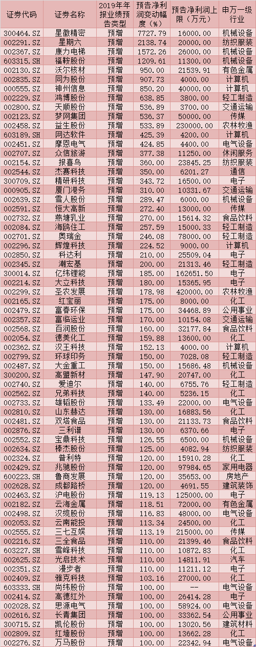 進(jìn)一步統(tǒng)計(jì)發(fā)現(xiàn),上述311家年報(bào)預(yù)喜公司中,除年報(bào)業(yè)績預(yù)計(jì)扭虧公司外,預(yù)計(jì)年報(bào)凈利潤同比增長超過100%的公司有67家,星徽精密、星期六、康力電梯、福鞍股份等4家公司均預(yù)計(jì)2019年全年凈利潤同比增長超過10倍,分別達(dá)到7727.79%、2138.74%、1572.26%、1209.61%,沃爾核材(950.00%)、同為股份(907.73%)、神州信息(850.20%)、鴻博股份(638.85%)、天順股份(536.89%)、夢(mèng)網(wǎng)集團(tuán)(536.37%)和益生股份(533.89%)等公司2019年全年凈利潤也均有望同比增長5倍以上。