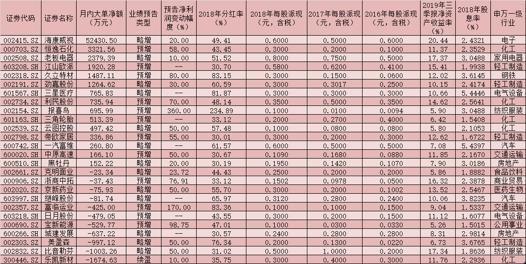 對(duì)于高分紅標(biāo)的篩選,分析人士建議從現(xiàn)金分紅、基本面等兩大角度進(jìn)行篩選,構(gòu)建高股息組合?,F(xiàn)金分紅:股息率高于1.5%、2016年以來連續(xù)分紅且2018年分紅率高于30%?;久妫?019年前三季度凈資產(chǎn)收益率超過5%且2019年全年業(yè)績預(yù)喜。根據(jù)上述條件進(jìn)行梳理共有26只年報(bào)預(yù)喜股具有高分紅潛力,這些公司包括三星醫(yī)療、一汽富維、繼峰股份、城建發(fā)展、江山歐派、日月股份等。