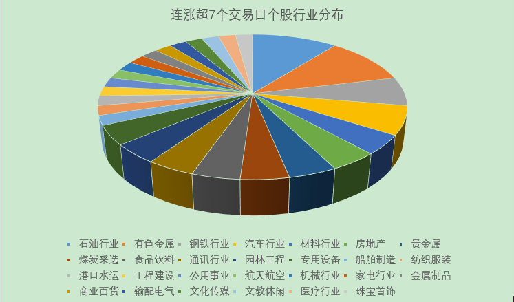 從行業(yè)角度來看,超過7個(gè)交易日連續(xù)上漲股涉及27類行業(yè),其中,石油行業(yè)、有色金屬行業(yè)均為5只,鋼鐵行業(yè)與汽車行業(yè)均為3只,貴金屬、煤炭采選、食品飲料、通訊行業(yè)、園林工程、專用設(shè)備等行業(yè)均為2只。