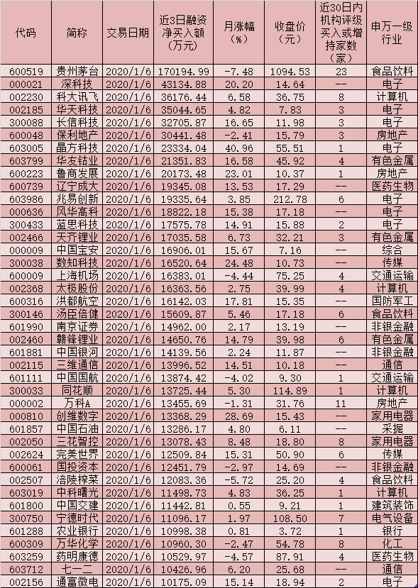 《證券日?qǐng)?bào)》記者根據(jù)同花順數(shù)據(jù)統(tǒng)計(jì)發(fā)現(xiàn),1月2日至1月6日的3個(gè)交易日里,滬深兩市共有1077只兩融標(biāo)的股實(shí)現(xiàn)融資凈買入,其中累計(jì)融資凈買入額超1億元的兩融標(biāo)的股達(dá)到41只,貴州茅臺(tái)(17.02億元)、深科技(4.31億元)、科大訊飛(3.62億元)、華天科技(3.50億元)、長信科技(3.27億元)、保利地產(chǎn)(3.04億元)、晶方科技(2.33億元)、華友鈷業(yè)(2.14億元)和魯商發(fā)展(2.02億元)等9只個(gè)股期間累計(jì)融資凈買入額均達(dá)到2億元以上。另外,包括遼寧成大、兆易創(chuàng)新、風(fēng)華高科、藍(lán)思科技、天齊鋰業(yè)、中國寶安等在內(nèi)的32只個(gè)股期間累計(jì)融資凈買入額均達(dá)到或超過1億元,上述41只個(gè)股合計(jì)融資凈買入額達(dá)到86.53億元。