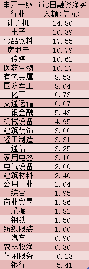 行業(yè)特征方面,在1月2日至1月6日期間,26個(gè)申萬一級(jí)行業(yè)期間實(shí)現(xiàn)融資凈買入,其中,計(jì)算機(jī)、電子、食品飲料、房地產(chǎn)、傳媒、醫(yī)藥生物等六行業(yè)期間融資凈買入額居前,均超10億元,分別為:24.80億元、20.39億元、17.55億元、10.79億元、10.62億元和10.27億元。