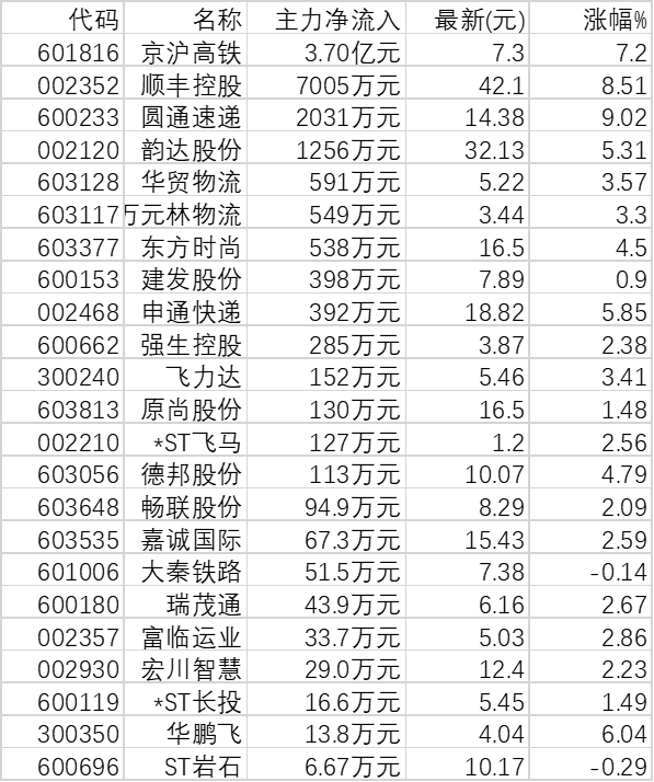 具體來看,交運物流板塊大單資金凈流入個股有23只,占板塊有交易個股比例為39.66%,合計大單資金凈流入5.1億元。大單資金凈流入前10位的個股分別為:京滬高鐵(3.70億元)、順豐控股(7005萬元)、圓通速遞(2031萬元)、韻達股份(1256萬元)、華貿(mào)物流(591萬元)、萬元林物流(549萬元)、東方時尚(538萬元)、建發(fā)股份(398萬元)、申通快遞(392萬元)、強生控股(285萬元)。