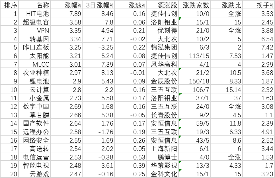 從板塊走勢來看,截至上午收盤,有299類板塊上漲,占比60.51%,HIT電池(7.89%)、超級電容(3.58%)、VPN(3.35%)等板塊居前3位;有35類板塊下跌,口罩(-1.98%)、流感(-1.12%)、人腦工程(-1.05%)等板塊居前3位。
