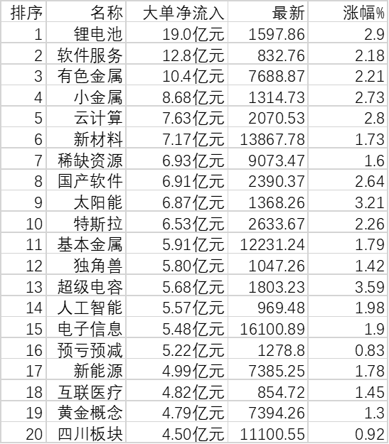 從大單資金流向來看,有98類板塊呈現(xiàn)大單資金凈流入,占比29.17%,凈流入板塊數(shù)較前一個(gè)交易日增長53.13%,鋰電池(19.0億元)、軟件服務(wù)(12.8億元)、有色金屬(10.4億元)等板塊位居前三;有238類板塊大單資金流出,融資融券(-53.6億元)、證金持股(-42.4億元)、標(biāo)普概念(-40.3億元)居前三位。