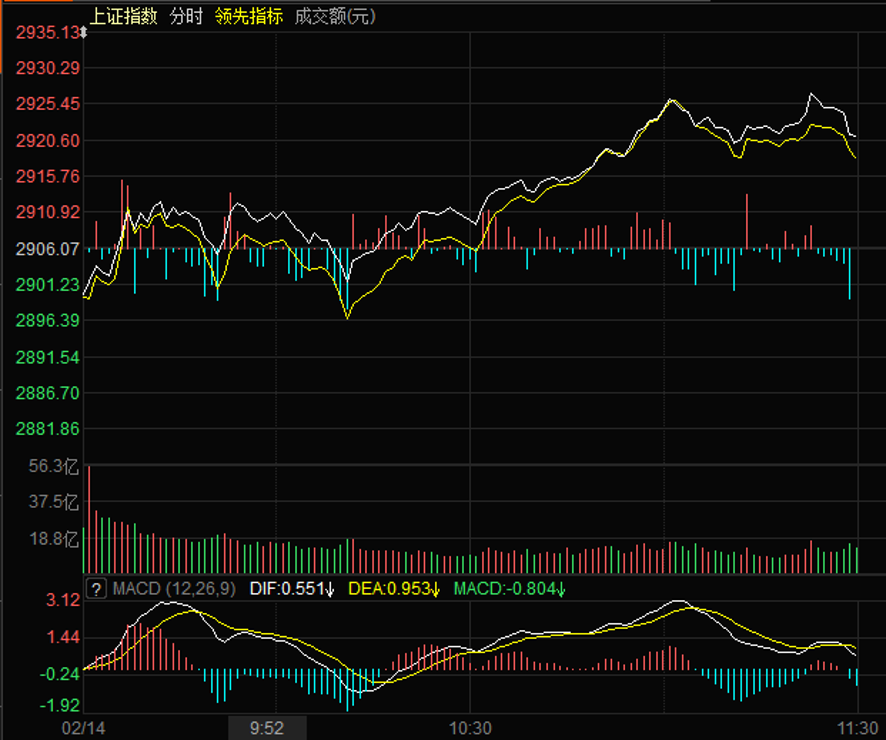 2月14日,滬深兩市略低開后拉鋸震蕩并不斷走高,在上午收盤前8分鐘三大指數(shù)出現(xiàn)回落趨勢。截至上午收盤,個股方面漲多跌少,有2273只個股上漲,占交易中個股總數(shù)的60.23%,下跌股1240只。截至早盤收盤上證綜指報2921.25點,上漲0.52%;深證成指報10949.68點,上漲0.79%;創(chuàng)業(yè)板指報2084.84點,漲幅達0.98%。